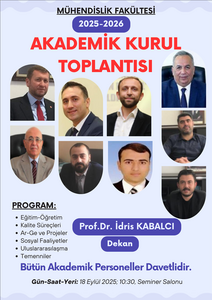 Mühendislik Fakültesi 2025 yılı Akademik Kurul Toplantısı 18 Eylül 2025 Perşembe günü Rektörümüz Sayın Prof.Dr. Abdurrahim ALKIŞ'ın katılıyla gerçekleştirildi. Dekan Prof.Dr. İdris Kabalcı, Nurettin Topçu’nun ifade ettiği gibi, “Maarif, ruhların içtimaî heyecanlarla terbiye edilmesidir”; bu anlayışla, mühendislik eğitimini yalnızca teknik bilgi aktarımı değil, ahlaklı, sorumlu ve topluma adanmış bireyler yetiştirme misyonu olarak görüyoruz, dedi. Hepinize verimli bir toplantı diliyor, katılımlarınız için teşekkürlerini arz ettiler.